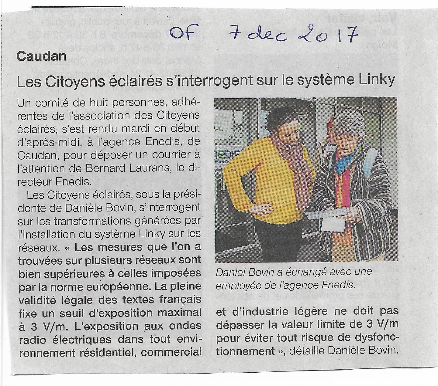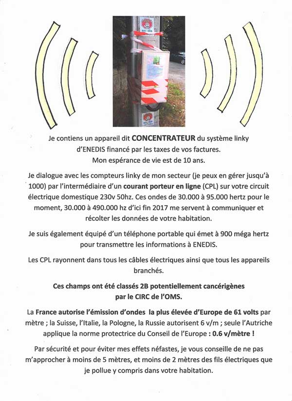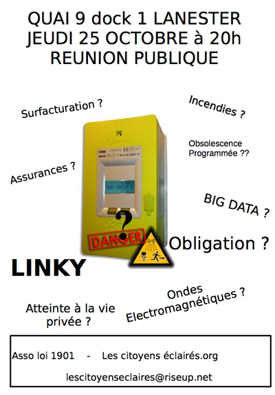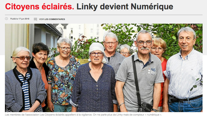 L’association Les citoyens éclairés continue sa campagne d’information au sujet de l’installation du compteur Linky. Ceux-ci sont en cours d’installation dans certains quartiers de la commune. Des permanences hebdomadaires sont relancées afin d’expliquer aux usagers leurs droits et les actions possibles pour refuser cette installation. Un retrait du compteur actuel pour le remplacer par le compteur vert à relevés par radiofréquences n’est pas une opération obligatoire....