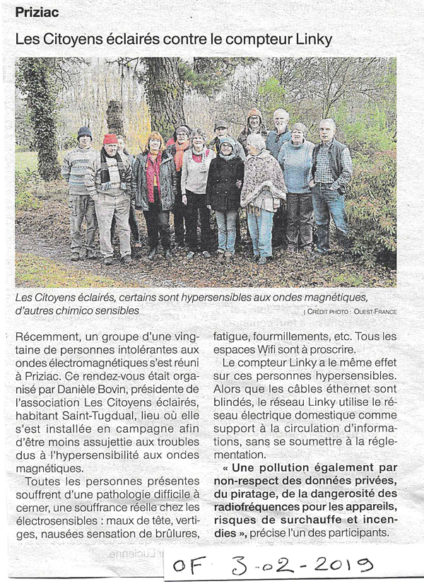 FR3 Bretagne a annoncé dans son reportage 5% d'électrohypersensibles en France aujourd'hui... S'agit-il des personnes recensées par les services de pathologies environnementales et professionnelles, 1 service dans chaque région, pour la Bretagne il s'agit de l'hôpital de Nantes, service du Docteur Tripodi 0240083635, 6 mois d'attente. Nous avons élaboré un document ci-joint afin de faire un recensement réel, car à la suite de la mise en place du système linky, de nombreuses personnes font état de symptômes relevant de l'hyperélectrosensibilité. Merci de le retourner à l'association."